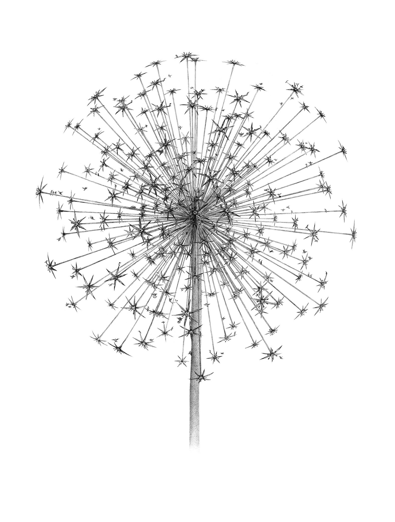The flower of life, filled with 100 tiny hummingbirds and a few other hidden extras. The sacred geometrical pattern known as the fleur de vie, featuring 6 sided flowers, is reflected in the shapes of the Allium on which this is based. A solar analemma (a pattern revealed if you took a picture of the sun once a month for a year and overlaid the images) is hidden in the flowerhead, representing the seasons and the annual renewal of life. Finally, inspired by ornate 18th century hand painted chinese wall paper, there's a single dragonfly representing freedom and new ways of being.
