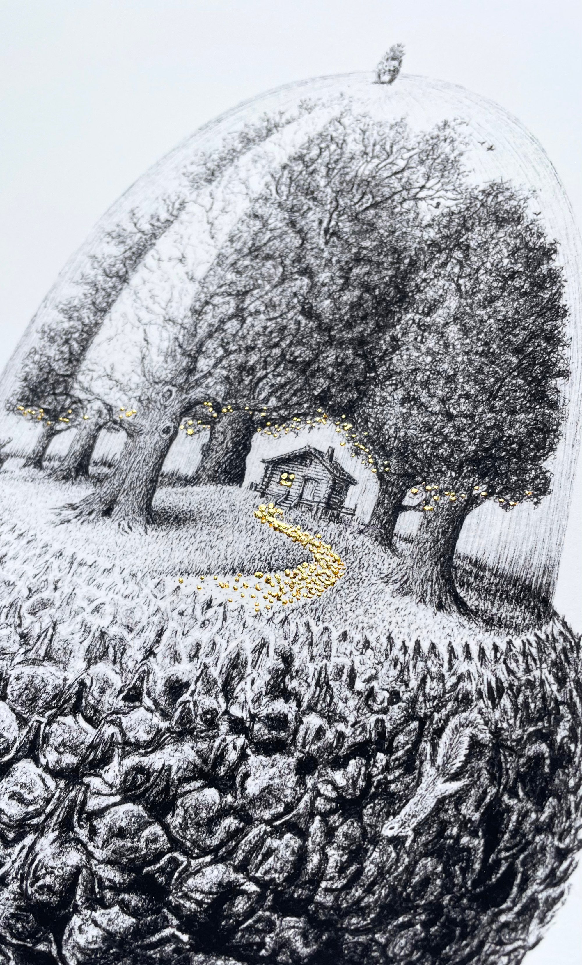 Acorn diorama illustration of a dense wooded copse with path leading up a hill to an idyllic secluded wood cabin. A tiny deer stands beneath the trees, while squirrels protect the outer acorn.